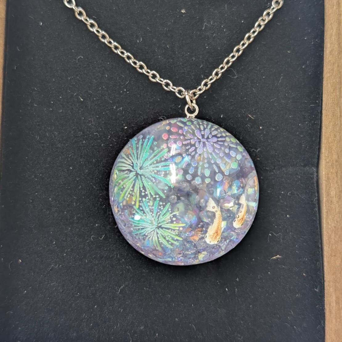 レジンネックレスのトップは写真では平面に見えますが球体です。動画をご覧ください!