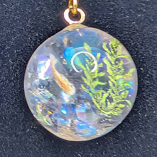 レジンネックレスのトップは写真では平面に見えますが球体です。動画をご覧ください!